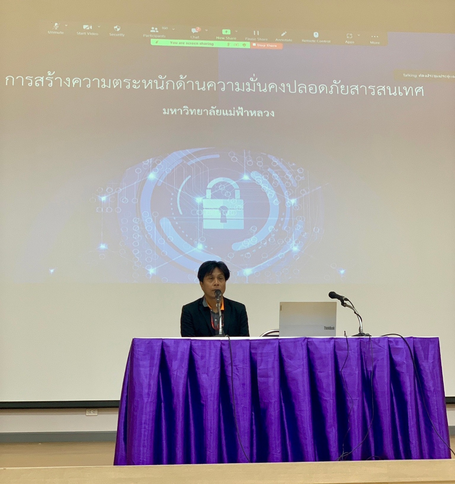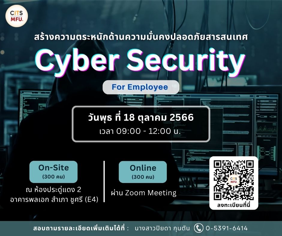 ศูนย์บริการเทคโนโลยีสารสนเทศ จัดกิจกรรมรอบรมหลักสูตร "สร้างความตระหนักด้านความมั่นคงปลอดภัยสารสนเทศ Cyber Security for Employee" ให้แก่บุคลากรมหาวิทยาลัยแม่ฟ้าหลวง โดยวิทยากร : คุณวิรัช สฤษดิ์อุรัศศิริ จากบริษัท ดาต้าฟาร์ม จำกัด พร้อมทีมงาน